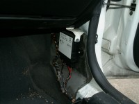 Pod obložením je šerná plastová krabička - RJ centrálu, která je přišroubovaná ke sloupku dvěma maticema M10. Pvolte si ji a vysuňte konektory z RJ. Potom jen na přísušné vodiče nacvakejte přes rychlospojky vodiče od modulu, zacvakněte zpět konektory přišroubujte jednotku. Já jsem na modul nakonec nalepil 3M oboustranou pásku a modul nalepil zvrchu na RJ. No a pak jen zacvaknout zpět plasty zašroubovat a je hotovo. Při použití těch rychlospojek odhaduju čas motáže na cca 20 minut.
