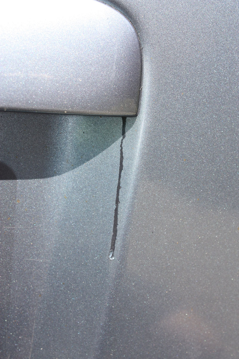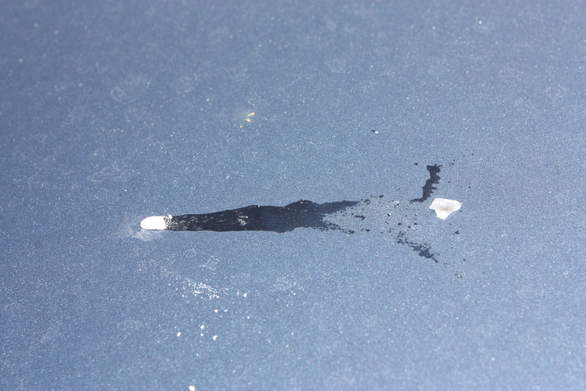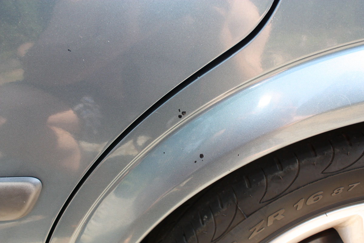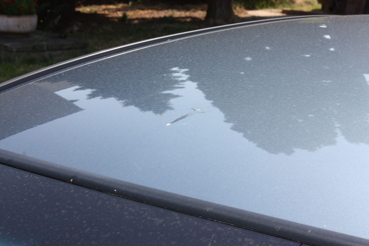 "Ďobky" na levém podběhu (od kamínků) Střecha (kdysi na to něco spadlo ze stromu a byl tam malý ďobek, na fotce na pralvé straně a a smerem k přednímu oknu to teklo, bílé místo na vlevo na fotce, blíže k oknu, byla kapka nahromaděného odrezovače. Tu jsem jen tak prstem oddrbnul a normálně to vzalo i lak, takže je to bílé - plnič.