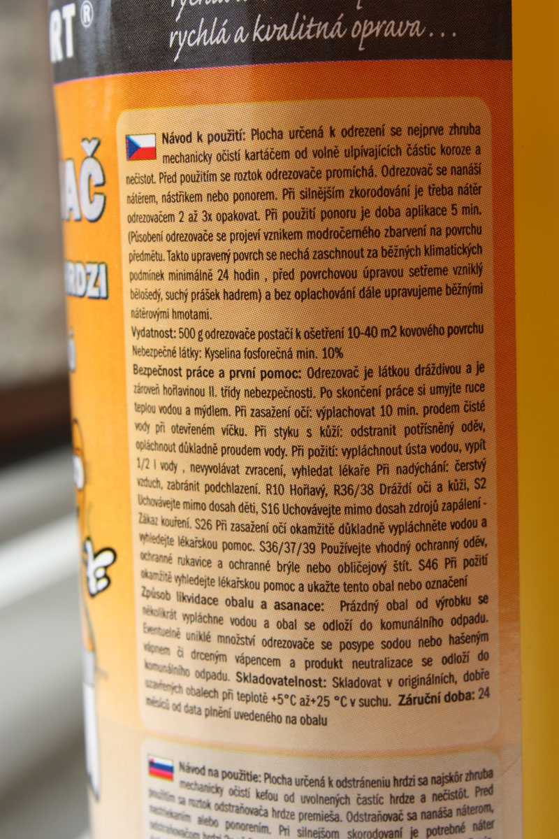 Můj problém byl v tom, že mi netěsnila guma pod víčkem nádrže a tak se tam v karosérii držela voda. Byť jsem po mytí to vyčistil, u deště se tomu zabránit nedalo. Bylo mi doporučeno, i tak jsem to nějak plánoval, že koupím odrezovač, a pak to natřu základním nátěrem, a barvou co je v tužce na moje auto. Je to pod víčkem, které je zavřeno, takže to není vidět, takže jen aby se to nešířilo dále. Tak jsem koupil tento odrezovač. Abych udělal opravu u toho víčka nádrže, což se povedlo, sice je to trošku focené na sluníčku, není to tak moc vidět a taky přes noc zrovna pršelo, takže trošku rezavé barvy zase vylezlo na povrch. Když jsem to měl v ruce, tak si říkám, zadělám i "ďobky" na kapotě a na kufru. Co se ale stalo, mně strašně udivilo a taky nasralo, že to tak musím na plnou hubu říct, protože tohle jen naštvat nejde.