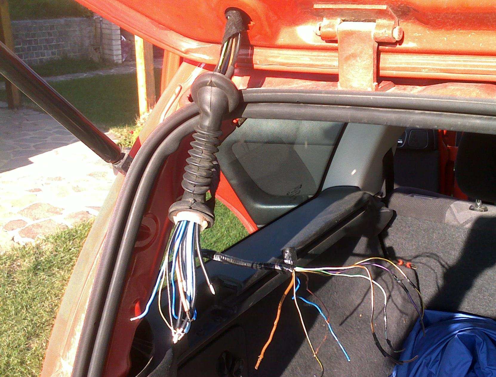 - v rozumnej vzdialenosti (cca 10cm) precvakol jeden kabel na strane kufra, vytiahol ho z prechodky a nechal volne vysiet v karoserii