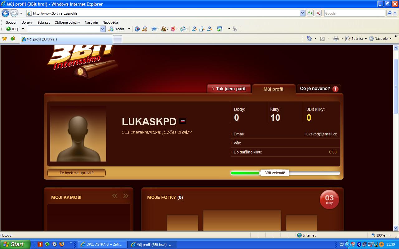 Bodů zatím jen 35 protože to včera neustále padalo tak jsem do půlnoci stihl jen 5 kliků a po půlnoci se podařilo všech 10 co jsem dostal na dnešek ale pak to zase spadlo a nechtělo najet takže mám něco přes 40 3bit kliků v zásobě. V práci se na tu hru nedostanu, jen na profil takže hrát budu až doma.