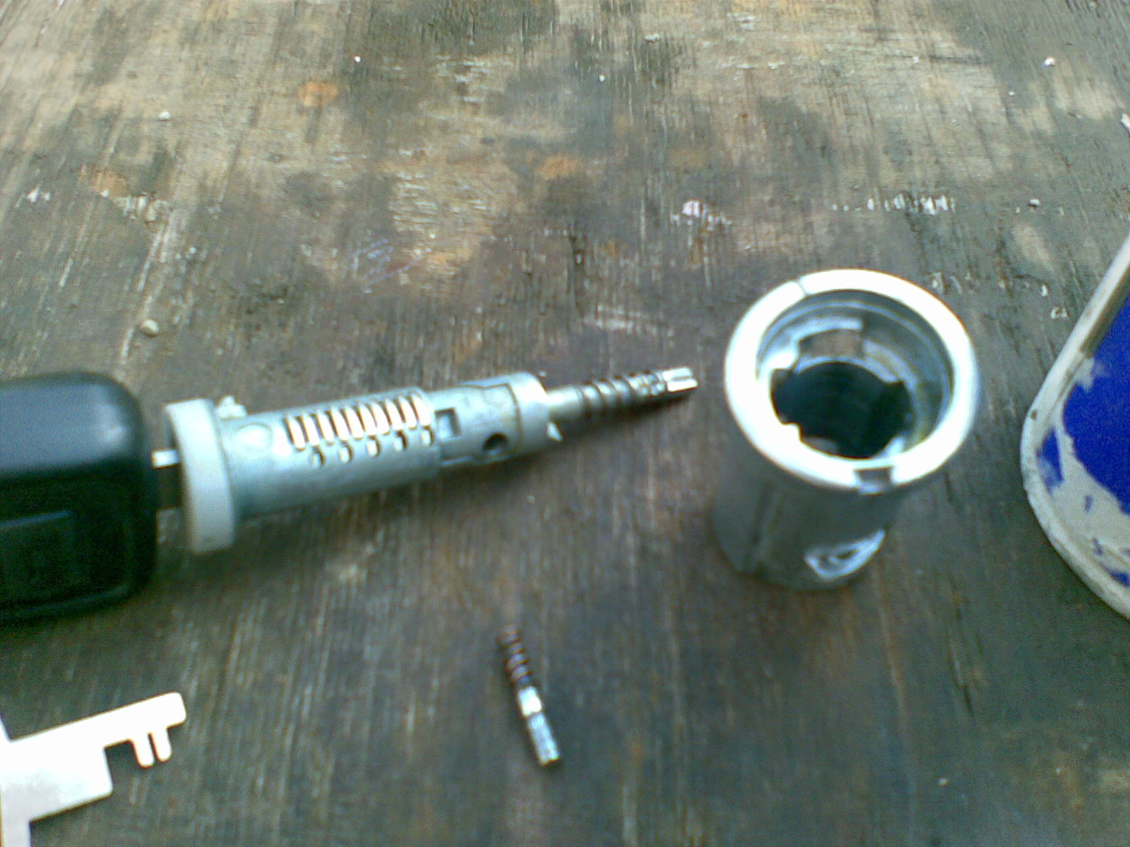 Každopádně si dovolím návodek trochu rozšířit. Omlouvám se za fotky pořízené mobilem, ale nevěděl jsem, že to budu až tak rozebírat a foťák jsem sebou tedy netahal. Myslím si že je sice hezké vložku vytáhnout ven, ale nejvíce bordelu je vevnitř v otočném mechanismu. Takže, když máme vložku venku, tak je dobré ji rozebrat úplně a to tak, že vytáhneme ten kolík, co se točí ve vložce - je nahoře. otočím do krajní polohy a zatalčím na něho, (je na pružince) a tím ho dostanu za krajní mez. Kolík pak vytáhnu a dávám pozor na pružinku, která by měla jít ven s ním. Pak spolu s klíčem vytahuju vnitřek vložky. KLÍČ ROZHODNĚ NEVYTAHUJU Z OTOČNÉ VLOŽKY !!! Rozsypaly by se "planžetky" a to by jaksi nebylo to pravé ořechové... (Klíč lze pak opatrně vytáhnout, ale je třeba planžetky držet jemně dvěma prstama !