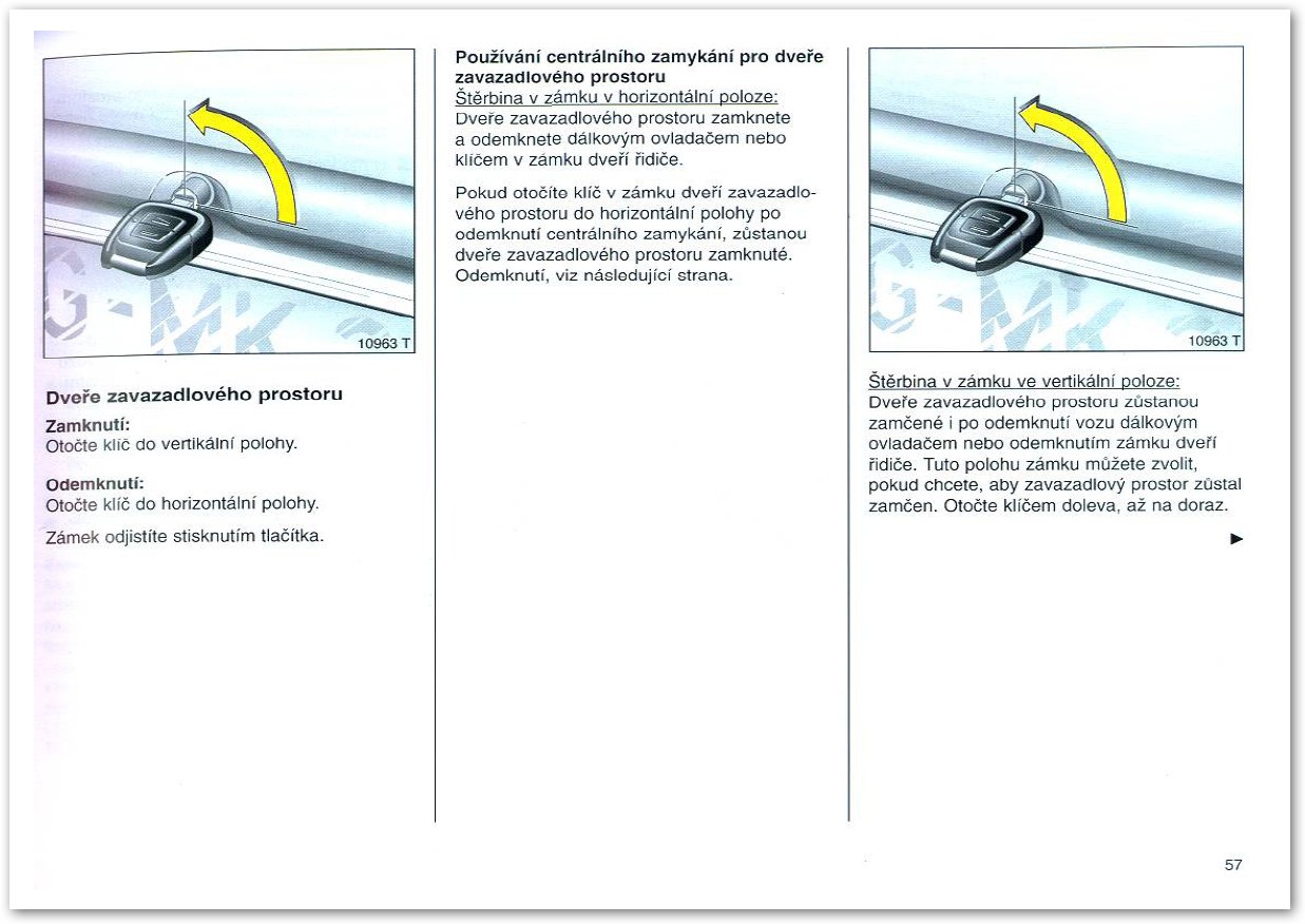 v manualu je obrazek, kde je nakresleno, ze pro uzamceni kufru se ma otočit klicem ale je to spoledne pro hatchback i coupe a me to nefunguje tam s tim klicem kvedlam jak chci ale nic se nezamkne.. mozna mam pojebany ten zamek ci co..