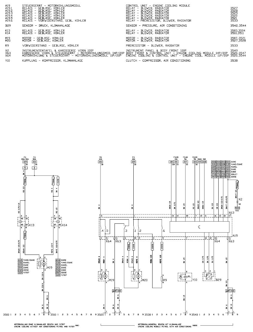 Tady máš zapojení větráků i s vyznačeným napájením. Ventilátory mohou běžet v různých režimech, od úplné série s předřazenými odpory, až do tvrdého paralelu. Podle barvy vodičů můžeš laborovat, ale bacha na zkraty! V každém případě budeš muset protahovat dráty do motoru, o tom se tu taky píše, hledej dodatečné zapojení předních mlhovek.