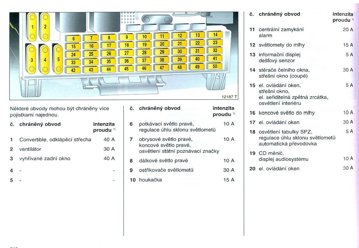 Dám sem čísla el. obvodů v závislosti na čísla pojistek, snad by to mělo sedět, i když některé obvody se mi až tak úplně nezdají.
