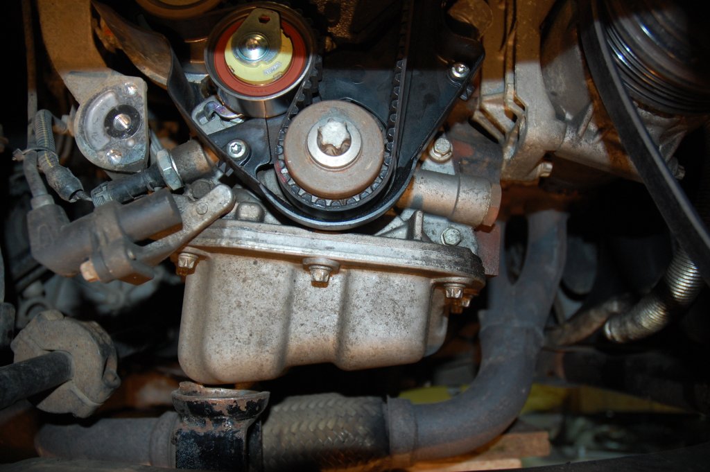 Poté musíme přizvednout motor (já dal hever pod pravou část olejové vany), a zvedáme tak dlouho, až se dostatečně odlehčí pravý závěs motoru. Ještě než jej povolíme, označíme si jeho přesnou polohu kvůli zpětné montáži. Poté můžeme celý závěs demontovat. Pokračujeme povolením středového šroubu řemenice kliky (ta spodní). U mě nastal problém s její aretací (prý to jde nějakým kolíkem, který se strčí do otvoru někde u převodovky, ale já ho nenašel). Tak jsem použil tyč, kterou jsem řemenicí prostrčil a opřel o vanu. Středový šroub včetně podložky natočíme zpět do klikové hřídele (pomocí něho budeme otáčet klikou). Poté odmontujeme horní kryt rozvodů (tři šroubky) a dolní kryt (jeden šroubek uprostřed a nacvakávací packy po stranách). Teď už je rozvodový řemen plně přístupný. Vytočíme všechny svíčky aby sme nemuseli překonávat kompresi. Otáčíme klikovkou po směru h.r. až budeme mít rysky na vačkových kolech proti sobě, zároveň musí být ryska na řemenici kliky proti rysce na zadním krytu. Na řemen si označíme směr jeho otáčení, plus značky na každé kolo vačky a na spodní řemenici. Povolíme střední šroub napínací kladky rozvodu a pomocí imbusu otáčíme excentrem kladky (směr ?). Řemen se povolí a je možné že se pootočí vačky. Opatrně stáhneme řemen, jde to docela těžko.