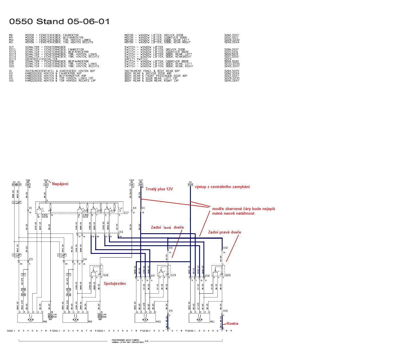 Nezbude ti, než zkontrolovat vydrátování mezi X3 (levé přední dveře) a X9 (levé zadní dveře - rudý 2,5; šedo-červený 0,5; modro-zelený 0,5; bílý 0,5) a X10 (pravé zadní dveře - rudý 2,5; šedo-bílý 0,5; modro-bílý 0,5; bílý 0,5). Sundat obložení prahu a podívat se do svazku, jestli se tam vodiče daných barev vyskytují. Jestli jsi na to šel metodou, že vezmeš kabeláž se stahovačkami z původních dveří a napojíš to jen do svých dveří, tak to jsi měl nejdřív prověřit, jestli máš nachystanou kabeláž i uvnitř votu. Některé vozy dle obsahu výbavy ani toto neměly. Takže zkontroluj kabeláž.
