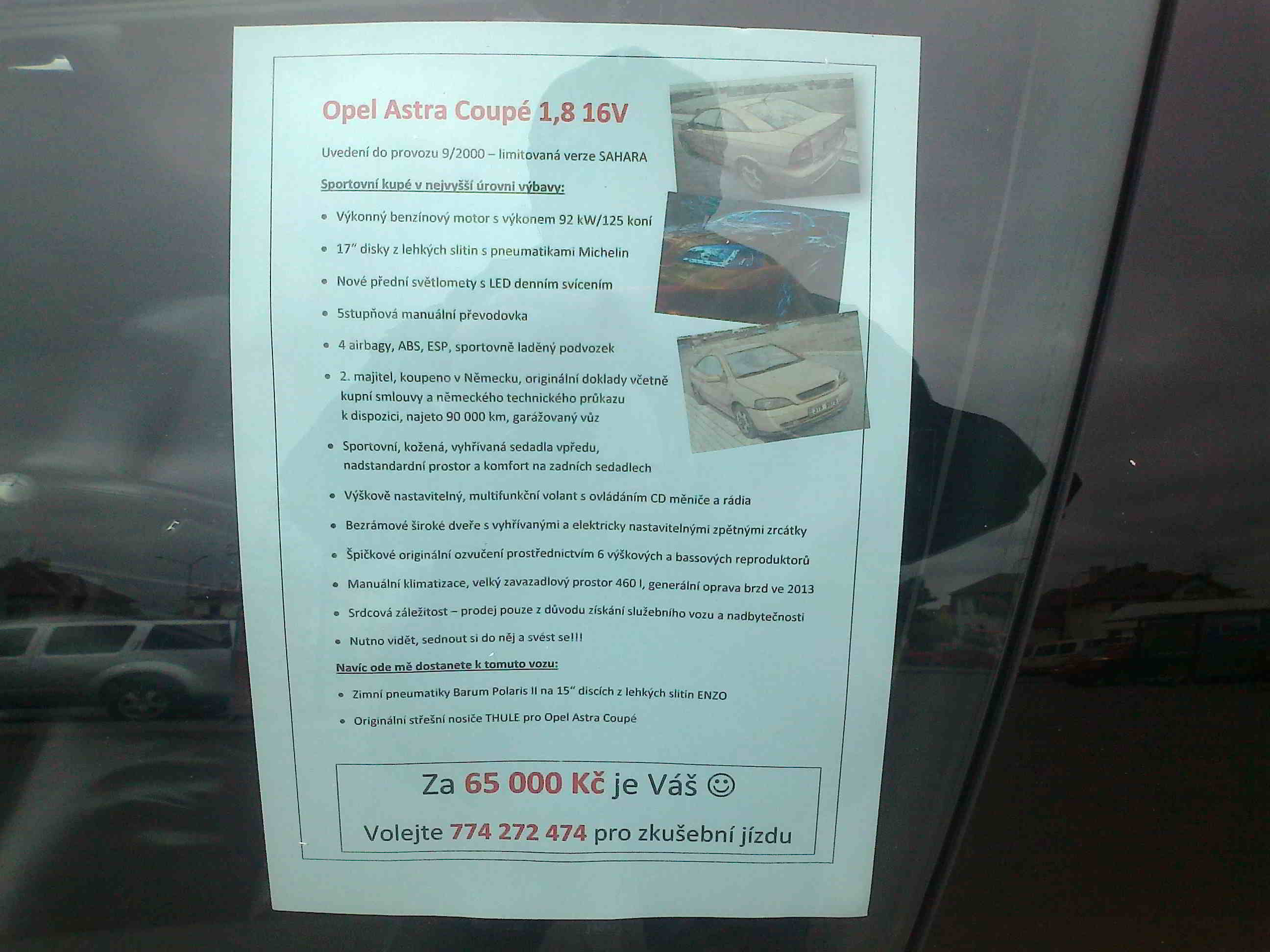 Dnes na parkovišti u opavského Tesca stála na prodej hezká astra G coupe v hodně dobré výbavě včetně kožených sedaček za 65 tisíc, má to už CZ SPZ a je to 1,8i 16V motor. Fotky v případě zájmu přepošlu. Foceno mobilem 5 MPX foťák! (Asha) Prodávajícího neznám, astru taky ne, ale vypadala hodně "TOP"