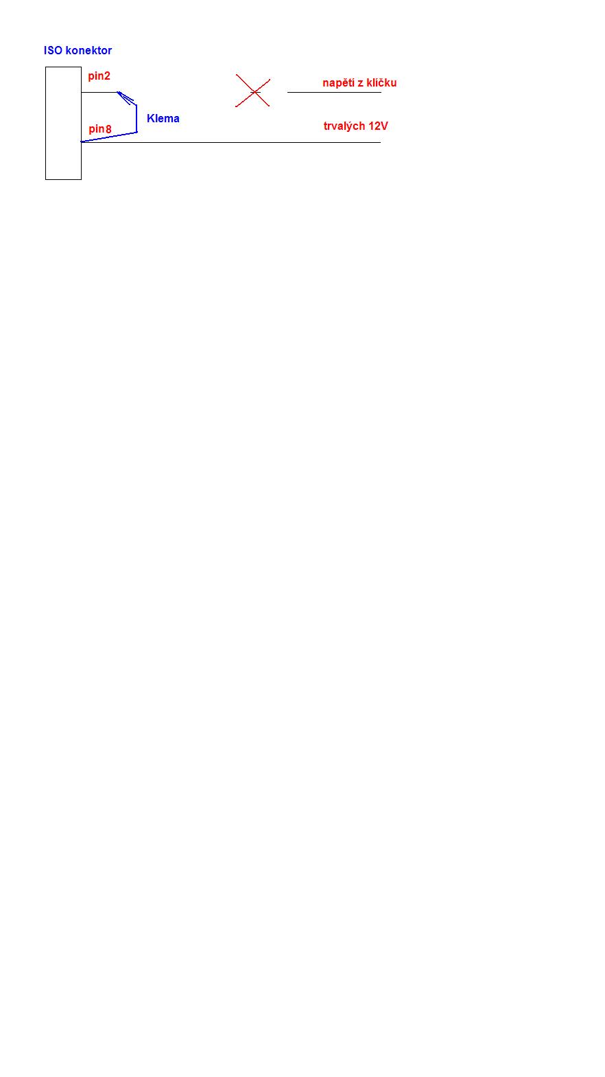 Napadlo mě vyzkoušet napětí na ISO konektorech. Přišel sen na to že mezi 4 a 8 mám stále napětí 12V, ale mezi 4 a 2 je pořád 0V i při zaplém motoru, schéma viz dole. Nevim čím to může být, pojistky jsou OK. Napadlo mě jestli sem nepoškodil kabely?(!)