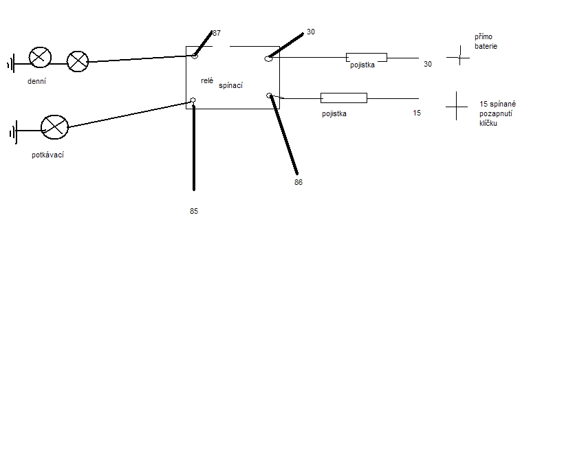 denní světla jsou zapojené přes sp.relé na 87 a 30 přímo na baterku,z relátka na parkovačky 85 a 86 ven na 15 spínanou klíčkem ,to by bylo vše dobrý ale jakmile dám pojistku na 30 od baterky tak den.nesvítí,nic nejde je slyšet relé jak cvakne ale den.světla nesvítí,ta 15 je napojená na to fial, relé v mot prostoru(tam jsem dal taky pojistku) na ty 15 pojistka nevadí(tu jsem tam dal co kdyby),přece to jde k čerpadlu,relátko jsem skoušel jakykoliv co mám ale chová se to naprosto stejně a ta pojistka na 15 tomu neva,ta na to nemá vliv,vyskoušel jsem i jakoukoli pojistku (teda 5-35)a stejně to nejde,chová se to stejně i když napojim den.přímo minus na baterku a 15 třeba na čidlo spojky.