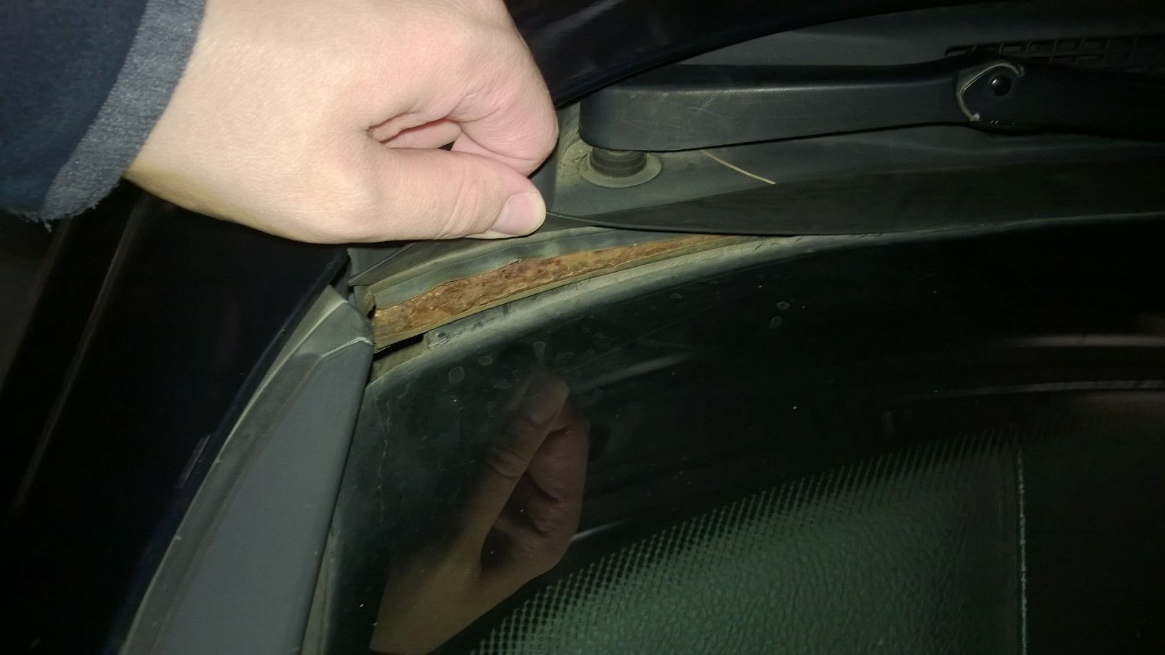 Do servisu se už chystám. Našel jsem si jiný, ale nejbližší volný termín maj 11. dubna. Aby toho nebylo málo, tak jsem až teprve dneska (po dvou týdnech ježdění nového/starého auta) zjistil, že guma pod čelním sklem je totálně pryč. Na bocích pod sklem se uplně šklebí (viz foto, strana u řidiče shora). Tudy se nejspíš do prostoru pod přihrádkou spolujezdce dostaly ty jehnědy a jiný bordel ze stromů. Navíc ve žlabu toho těsnění je silná vrstva vysypané koroze. Asi to také bude souviset s tou klimatizací. Jestli mi dovnitř dlouhodobě zatýkala voda (nevím jak dlouho u předchozího majitele), tak tipuji že to mohlo udělat ledacos s elektrikou. :(