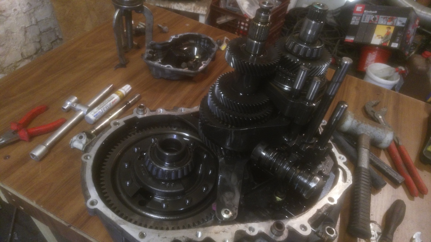 Takže tohle byl první prostoj, nakonec obě ložiska vyměněné, převodovka složená a hurá vše složit. A to byl bohužel průser. Po startu a protočení diferáku na špalkách ( trvalo to skoro přesně měsíc a nafta nespadla