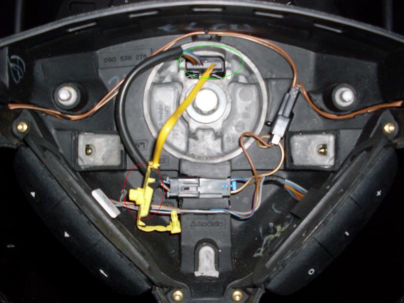 Tak sem se dneska už pustil do airbagu. každopaně sem se nikam moc nedostal. Zde na fotografii sem odpojil žlutý konektor (červené kolečko) ale nepodařilo se my vytáhnout konektor(zelené kolečko) Přoč?? a poté musím sundat ještě volant abych se dostal ke kroužku.