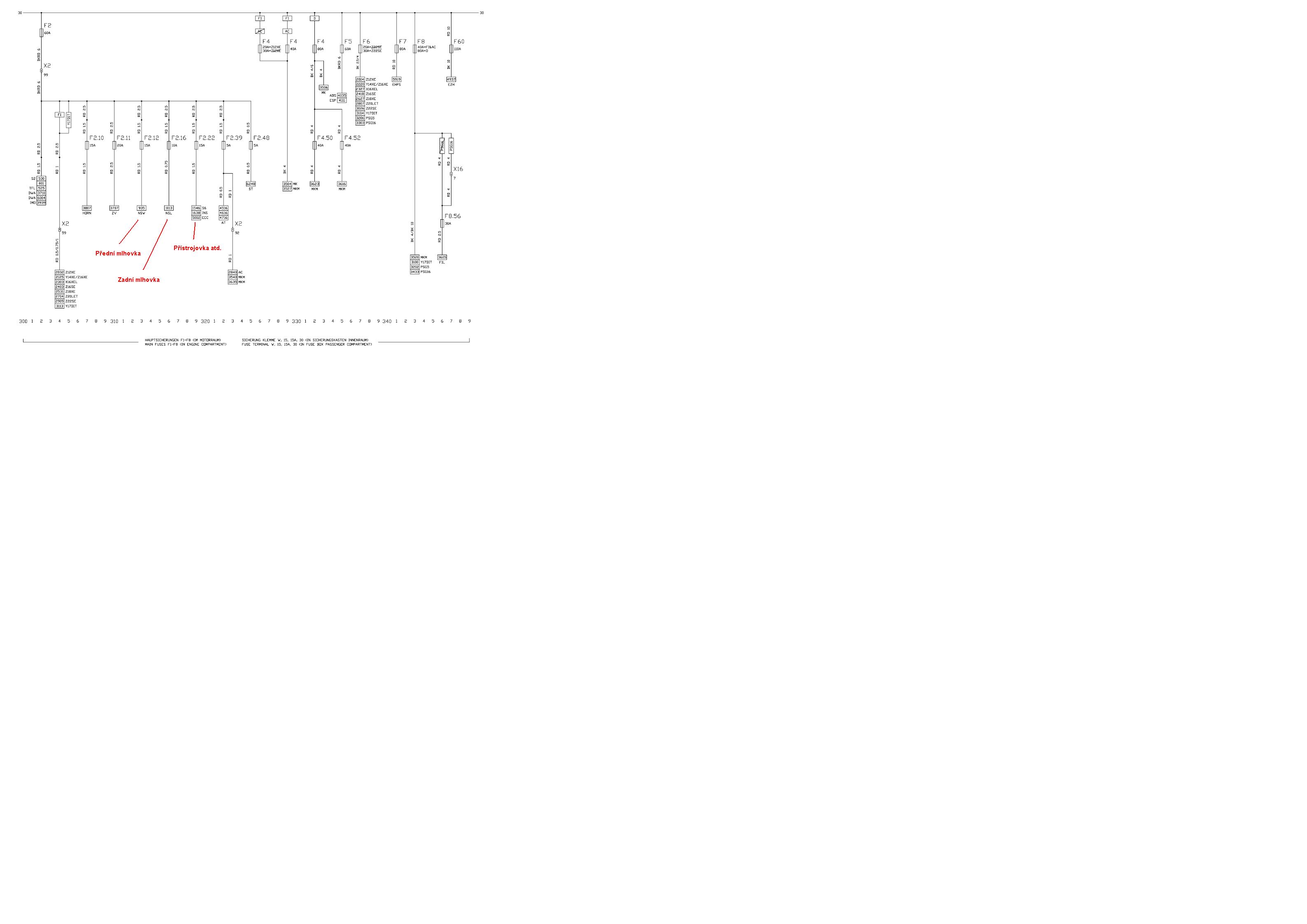 Osvětlení SPZ a multitimer je také krmený z F2.18, nadřazená je F2 (60A) v motoru.