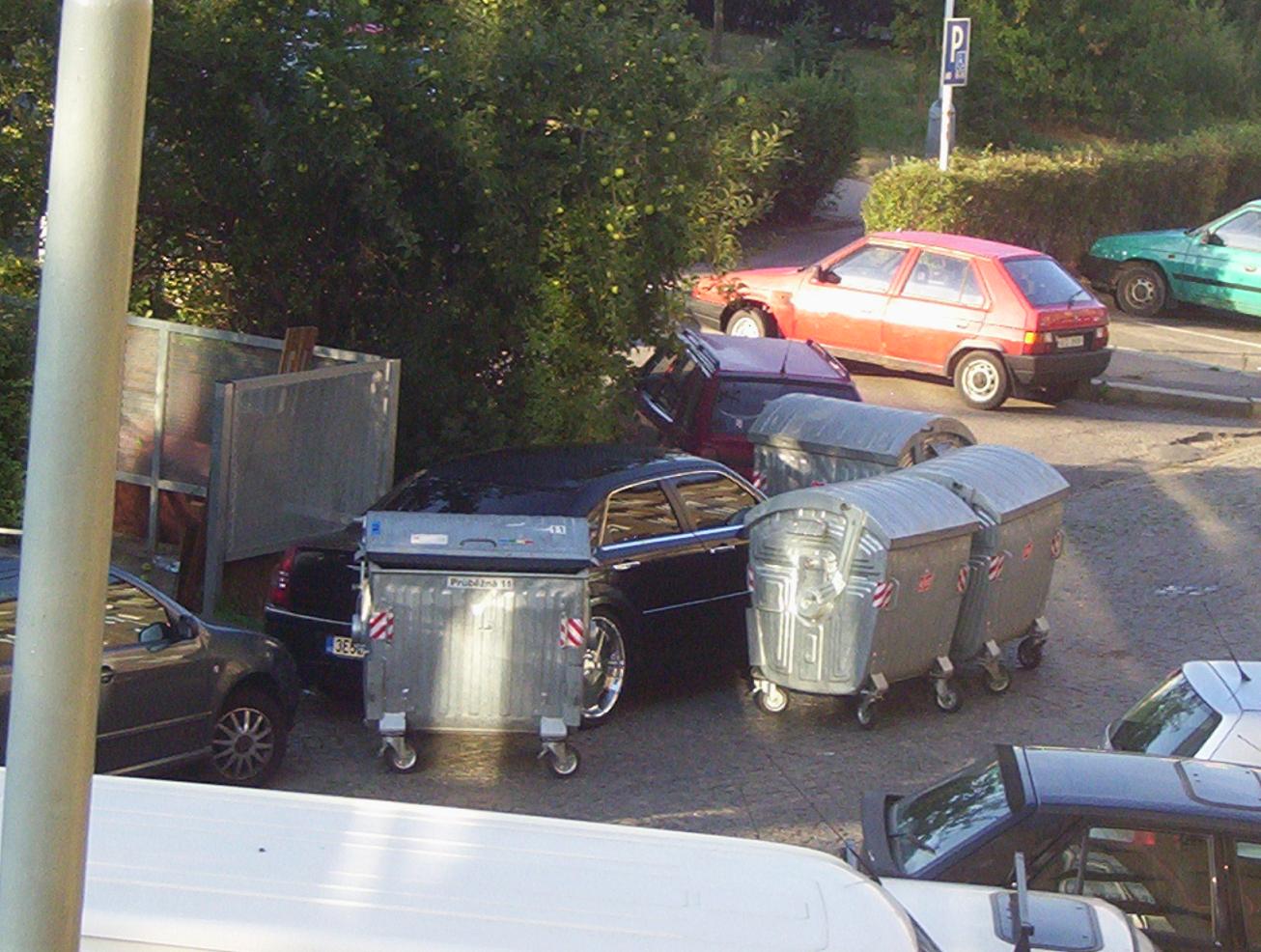 a druhe foto....takhle to vypada kdyz si machr s amerikou mysli ze si muze zaparkovat kde chce....ovsem narazil na popelare a branil jim v jejich praci....zaparkoval jim pred ohradkou s popelnicema...tak mu to trochu osladili (foceno z meho okna