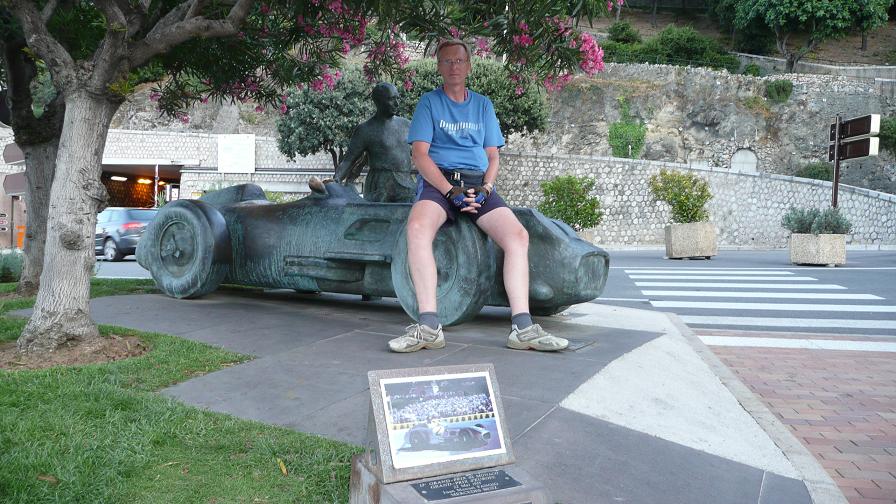 Památník v Monte Carlu. Juan Emanuel Fangio a MB z roku 1955.