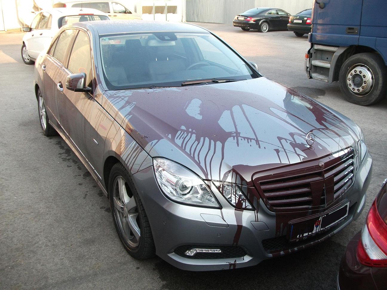 Pěkně! Ty jo, no to musel někoho pěkně naštvat. Nebo nějaký podnikatel, co ho někdo nemá prostě rád. Že to lidem za to stojí. Doufám že ho chytnou, že to bylo někde pod kamerou.. To máte na opravu jo? Co s tím, jde to čistit, nebo nový lak?