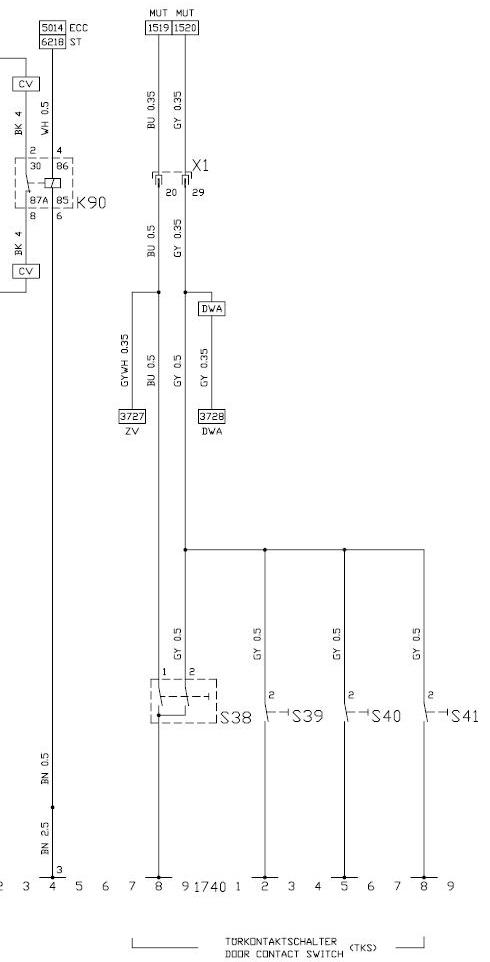Skús premerať, či ti ten dverný spínač S38 spína kostru na vývode 20 konektora X1. Z toho konektoru to ide priamo na vývod 14 Multitimeru a pred konektorom odbočuje na vývod 15 Riadiacej jednotky centrálneho zamykania. Keďže ti nefachá ani pískanie nevytiahnutého kľúča z Multitimeru a ani zamknutie na závoru, je fakt možné, že je problém na spínači S38 na kontakte č. 1.