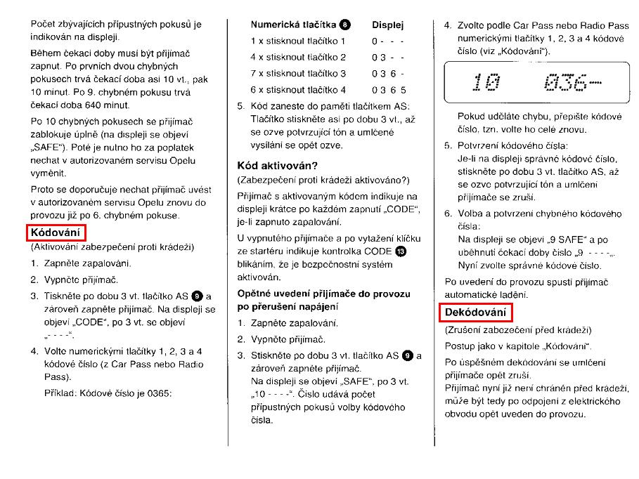 Odpojit baterku nepomůže, po zadání třech špatných kódů se prodlužuje doba na zadání dalšího pokusu na cca 30 minut. Takže nechat zapnuté zapalování a čekat, až se objeví další možnost pro zadání kódu.
