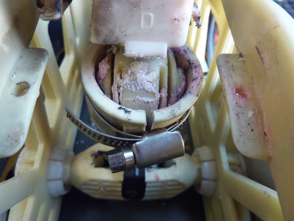 Takže, ničím jsem vůli nevyplňoval, ale zmenšil jsem oko kolem řadící páky. V nejužším místě (směrem do kabiny) jsem oko přeříznul, aby vznikla vůle ke stažení. V místě uchycení oka k tyči jsem vrtákem vytvořil úzký otvor. Tudy jsem protáhl kovový stahovací pásek na hadice a oko stáhnul. Fotky poví víc.