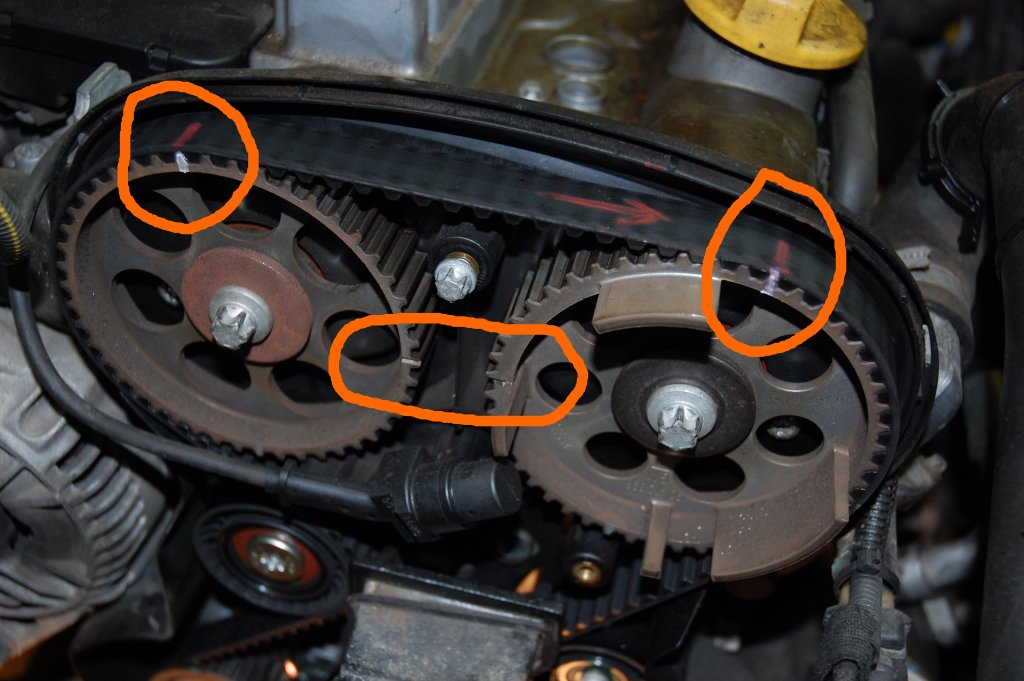 Poté musíme přizvednout motor (já dal hever pod pravou část olejové vany), a zvedáme tak dlouho, až se dostatečně odlehčí pravý závěs motoru. Ještě než jej povolíme, označíme si jeho přesnou polohu kvůli zpětné montáži. Poté můžeme celý závěs demontovat. Pokračujeme povolením středového šroubu řemenice kliky (ta spodní). U mě nastal problém s její aretací (prý to jde nějakým kolíkem, který se strčí do otvoru někde u převodovky, ale já ho nenašel). Tak jsem použil tyč, kterou jsem řemenicí prostrčil a opřel o vanu. Středový šroub včetně podložky natočíme zpět do klikové hřídele (pomocí něho budeme otáčet klikou). Poté odmontujeme horní kryt rozvodů (tři šroubky) a dolní kryt (jeden šroubek uprostřed a nacvakávací packy po stranách). Teď už je rozvodový řemen plně přístupný. Vytočíme všechny svíčky aby sme nemuseli překonávat kompresi. Otáčíme klikovkou po směru h.r. až budeme mít rysky na vačkových kolech proti sobě, zároveň musí být ryska na řemenici kliky proti rysce na zadním krytu. Na řemen si označíme směr jeho otáčení, plus značky na každé kolo vačky a na spodní řemenici. Povolíme střední šroub napínací kladky rozvodu a pomocí imbusu otáčíme excentrem kladky (směr ?). Řemen se povolí a je možné že se pootočí vačky. Opatrně stáhneme řemen, jde to docela těžko.