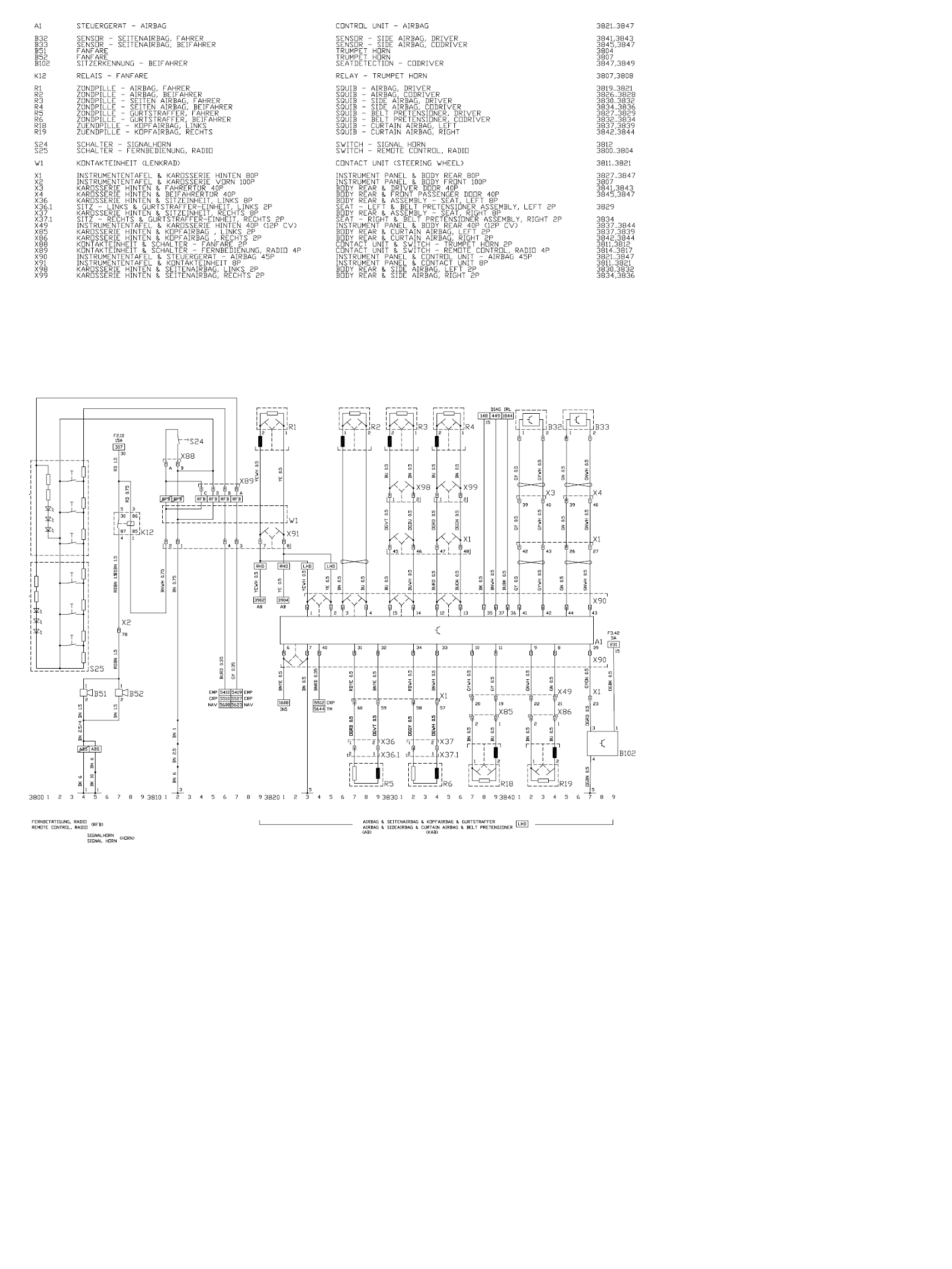 Podle schématu je cívka relé klaksonu K12 spínaná tlačítkem S24 na volantu proti kostře. Typoval bych to na prodřený či ukroucený vodič na kroužku pod volantem a opírá se ti o kostru, čili relé je stále sepnuto a fanfáry B51, B52 stále troubí. Sundal bych kryt airbagu (při vypnutém zapalování!) a zkontroloval kroužek. Postup demontáže je buď v knize Jak na to nebo zde. Konektor kroužku je X91.